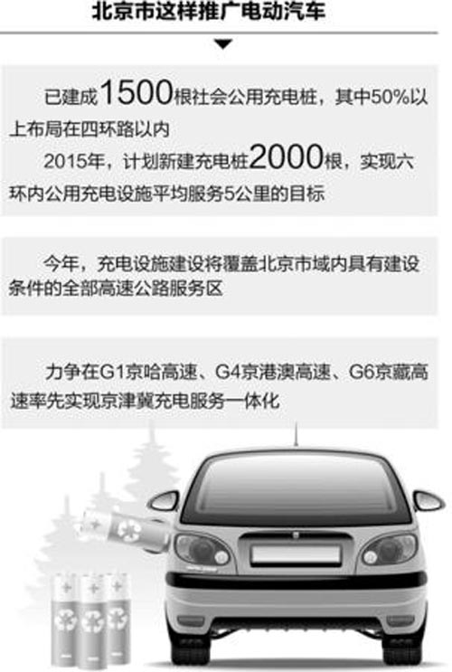 据介绍,充电设施建设的下一个重要目标是覆盖高速公路服务区,进而与天津、河北沟通对接,实现京津冀充电服务一体化。2015年,北京市计划新建充电桩2000根,实现本市六环内公用充电设施平均服务5公里的目标。目前已建成约200根,在建约1000根。