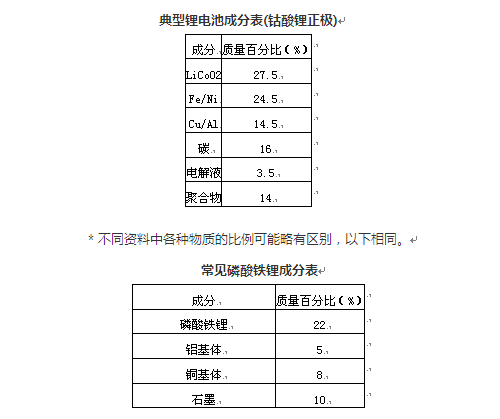 电池中有多种重金属污染物,但是这些污染物大多都有经济价值。目前常用的锂离子电池正极材料有 LiCoO2,LiNiO2,LiMn2O4,LiFePO4和三元材料等,正极材料、乙炔黑导电剂与有机粘合剂涂覆于铝箔上构成正极,负极主要是由片状碳材料、无定形碳材料涂覆于铜箔上构成。电解质溶液中的电解质盐一般为 LiCF3SO3,LiBF4和LiPF6等锂盐,常用的溶剂有碳酸乙烯脂(EC)、碳酸丙稀脂(PC)、碳酸二甲脂(DMC),甲基乙基碳酸酯(EMC)等。