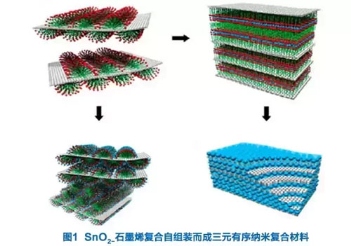 锂离子电池方面。锂离子电池通过锂离子在正负两极之间的移动来进行工作,因此电池正极材料的导电性能则会密切关系到锂离子电池的能量密度和功率性能。实际上,大部分电极材料的比容量都与理论上可达到的比容量相距甚远,尤其是在大电流充放电时,电极材料的比容量会大幅下降。石墨烯材料因具备优异的电子导电性,被应用到锂电子电池的研究中。石墨烯层应用于电池的正极材料中,不仅可以减少电池的界面电阻,便于锂离子在电池的正负两极间传导,还有助于减慢金属氧化物溶解相变的速度,从而保证锂电池的电极在电循环周期中保持结构。有科学家采用三元共组装法,将氧化锡与石墨烯整合在一起,与表面活性剂多元协同,制备出三元有序纳米复合材料(见图1),该材料用于电极的比容量可达到760 mA•h/g,且该材料是一种良好的缓冲材料,利于提高锂离子电池电极材料的循环稳定性。
