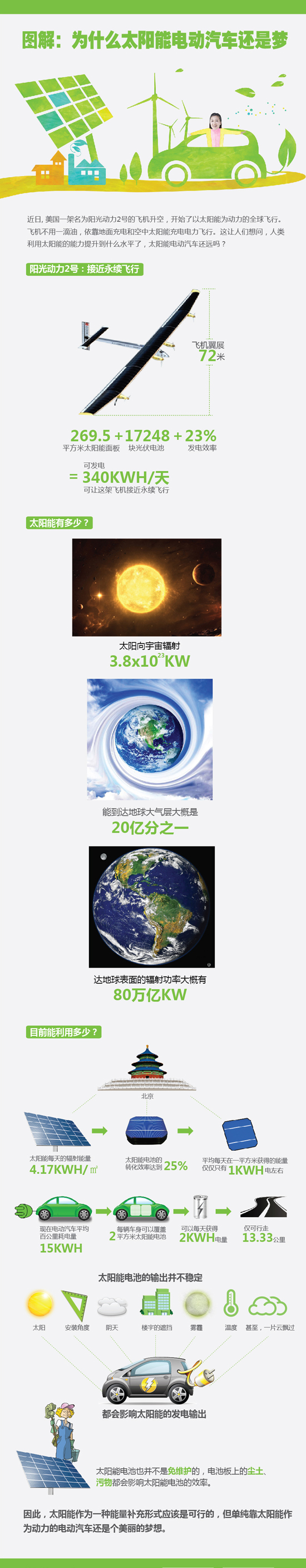 近日, 美国一架名为阳光动力2号的飞机升空,开始了以太阳能为动力的全球飞行。飞机不用一滴油,依靠地面充电和空中太阳能充电电力飞行。这让人们想问,人类利用太阳能的能力提升到什么水平了,太阳能电动汽车还远吗?