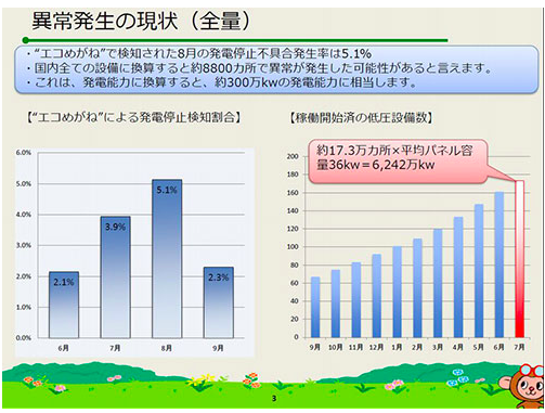 依“生态眼镜”的用户中8月份有5.1%的设备停止发电的数值推算,日本全国已启动的所有低压光伏发电系统中,约8800座发电系统停止发电。这类停止发电的情况如果不采用远程监控系统,就很难迅速掌握。据称日本全国投入运转的约17.3万件低压发电系统中,约80%尚未设置监控系统。低压项目因允许停止后自动恢复,因此有的会自动再并网售电,但手动恢复模式下,如果不知道发电停止,可能就会造成售电量减少。