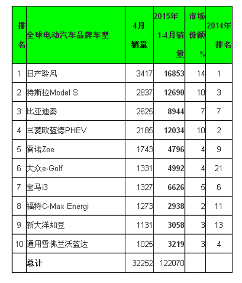 4月份,全球电动汽车市场销售了约32000辆纯电动和插电式混合动力乘用车,同比大增45%,表明市场走向稳健,但是北美和日本市场有放缓迹象。