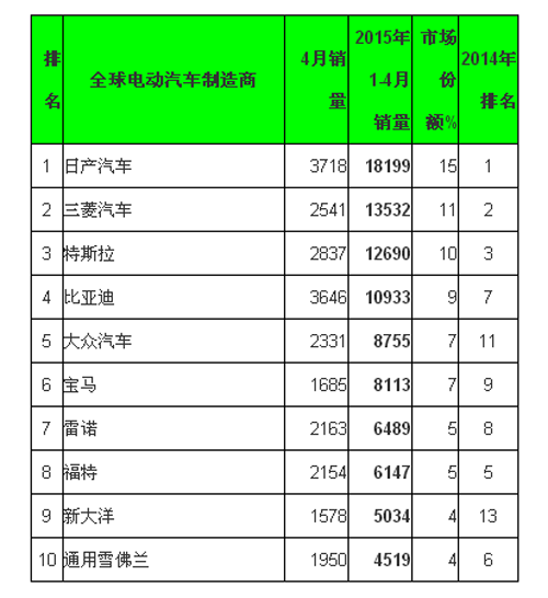 今年前4个月的累计销量排名显示出两个重大变化,原来在后面徘徊的新大洋知豆跃升至第九位,累计销售3058辆,福特C-MAX Energi插电式混合动力车也取得了有史以来的最好成绩,以1273辆返回前十。