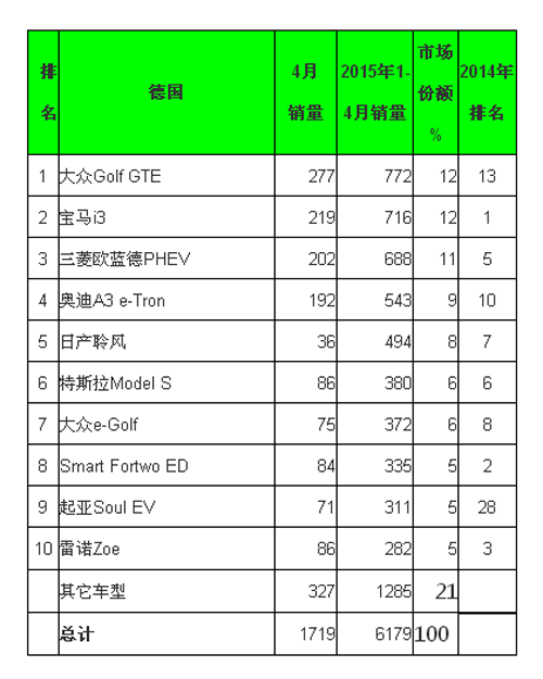 从今年前4个月的累计销量看,高尔夫GTE已经把宝马i3拉下马,三菱欧蓝德PHEV维持住第三名。奥迪A3 e-Tron攀升到第四位,超越了日产聆风,而特斯拉Model S则上升一位至第六。