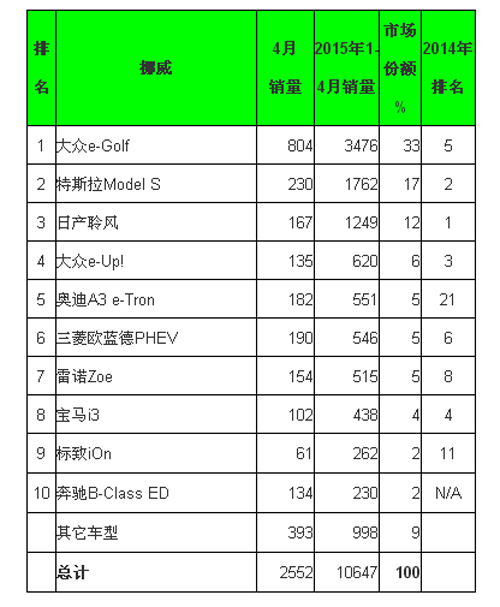 4月,挪威也有新车入市,大众高尔夫GTE终于登陆挪威,以144辆的成绩夺取第七名,未来,这款车有望引领插电式混合动力市场,就像它的大哥e-Golf一定统领纯电动车型。奥迪A3 e-Tron和欧蓝德PHEV将遭遇强劲对手。