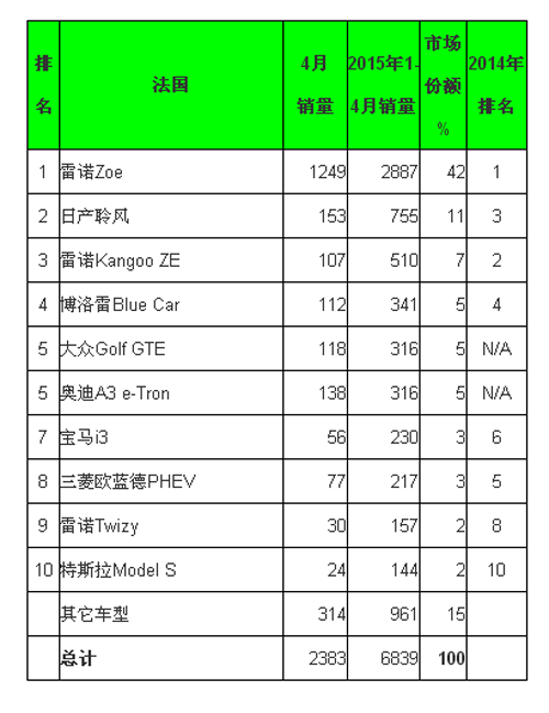 4月,法国插电式汽车销量创出历史新高,市场占比终于超过了1%的关口,看起来法国市场正在走上正轨,政府每辆电动汽车补贴一万欧元鼓励购车的钱没白花。