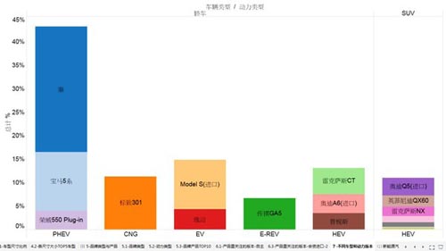 从动力类型来看,SUV车型目前主要集中在传统混合动力(HEV)类型中,PHEV类型中并未出现SUV,纯电动车中,除品牌知名度最高的特斯拉外,用户对产品的关注还是主要集中在了长安逸动EV这款车型上,表现出逸动EV在该细分市场具有一定的竞争力,而HEV车型中排名前三的均以进口合资车型为主。