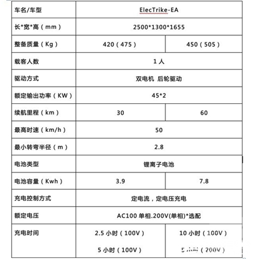表:ElecTrike性能参数