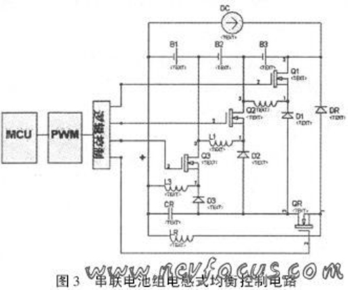 系统中,及时检测电池组中各电池的状态信息,送入MCU中,通过算法处理,控制PWM的输出,驱动开关器件的导通和关断。当某个电池电压较高时,相应的开关器件导通,电池将能量储存到相应的电感中,当开关断开后,能量转移到下游的电池,多余能量转移到公共电容上并回馈给充电电路。