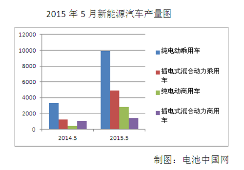 根据机动车整车出厂合格证统计,2015年5月,我国新能源汽车生产1.91万辆,同比增长3倍。其中,纯电动乘用车生产9922辆,同比增长3倍,插电式混合动力乘用车生产4923辆,同比增长近4倍;纯电动商用车生产2832辆,同比增长7倍,插电式混合动力商用车生产1431辆,同比增长36%。列入《免征车辆购置税的新能源汽车车型目录》前四批的新能源汽车生产1.78万辆,占5月产量的93%。