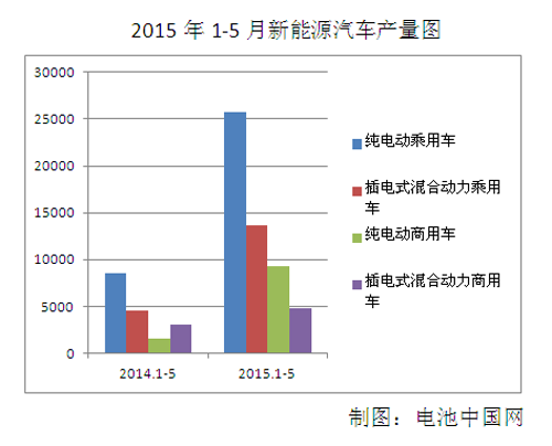 2015年1-5月,新能源汽车累计生产5.36万辆,同比增长近3倍。其中,纯电动乘用车生产2.58万辆,同比增长近3倍,插电式混合动力乘用车生产1.37万辆,同比增长3倍;纯电动商用车生产9248辆,同比增长近6倍,插电式混合动力商用车生产4761辆,同比增长58%。