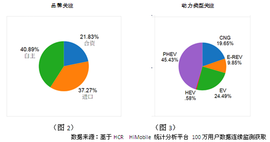 在传统汽车市场领域,自主品牌失势的格局在短时间内难以实现扭转,但今年新能源汽车政策密集出台,从HCR(慧辰资讯)HiMobile的监测数据来看,5月下旬用户对自主品牌新能源汽车的关注度达到40.89%,弯道超车正待观察。同时,纯电动汽车(EV)市场领域绝大多数为自主品牌,如北汽E150EV、比亚迪E6、腾势、江淮和悦iEV以及荣威E50等,但从HiMobile的监测数据来看,用户仍然倾向选择插电式混合动力汽车(PHEV),而且本次上海车展上推出多达数十款插电式混合动力车型,短期内插电式混合动力抢占新能源汽车市场已成为必然。