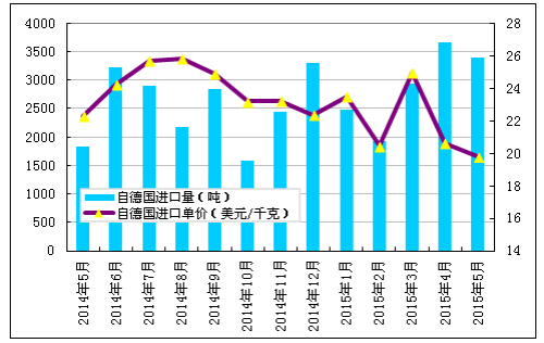2015年5月份从德国进口多晶硅量减少至3402吨,环比降幅为7.2%;5月份进口单价下滑至19.78美元/千克,环比跌幅为4.1%。