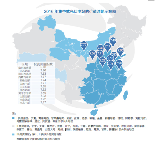 我国太阳能资源区分为三类,自2016年1月1日起,我国光伏标杆上网电价执行新标准,I、II类资源区分别降低10分钱、7分钱,III类资源区降低2分钱。根据上网电价这一变量要素,利用投资价值指数公式计算可得出,上网电价的下调,使三类资源区的投资价值显现。