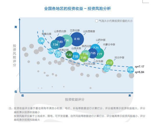 如同水往低处流一样,资金也会向交易成本低的地方集中,这一“洼地效应”,同样适合光伏领域。在远景2016年中国光伏资源投资价值地图中,从投资收益和投资风险两个方面对价值洼地进行分析,为电站投资者投资决策提供依据。其中,投资收益主要考察了辐照资源、上网电价、补贴及落实情况等;投资风险主要考察了限电及其趋势、土地成本、可开发容量、自然风险等。